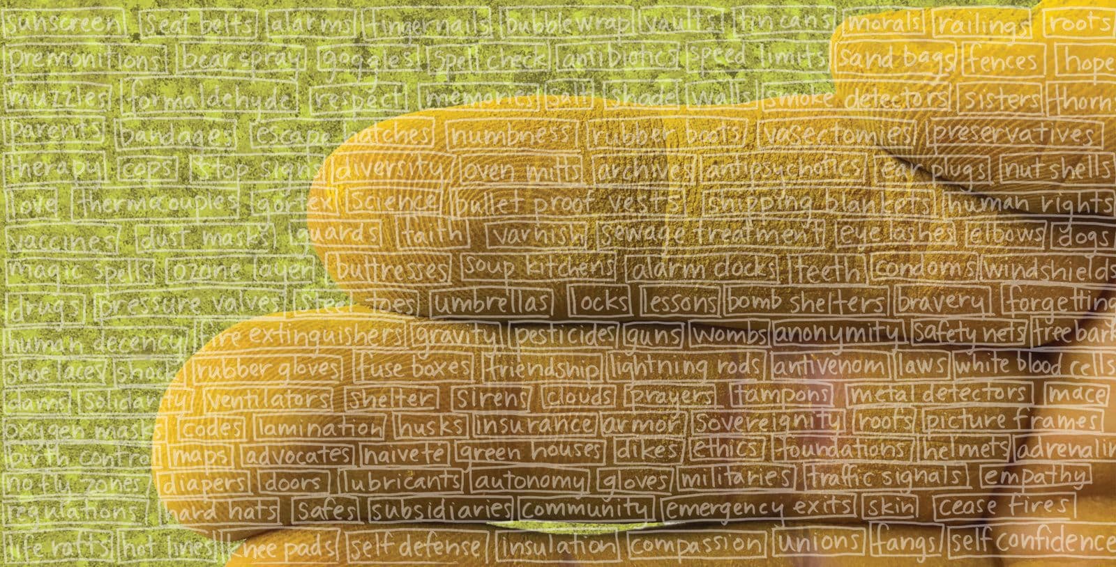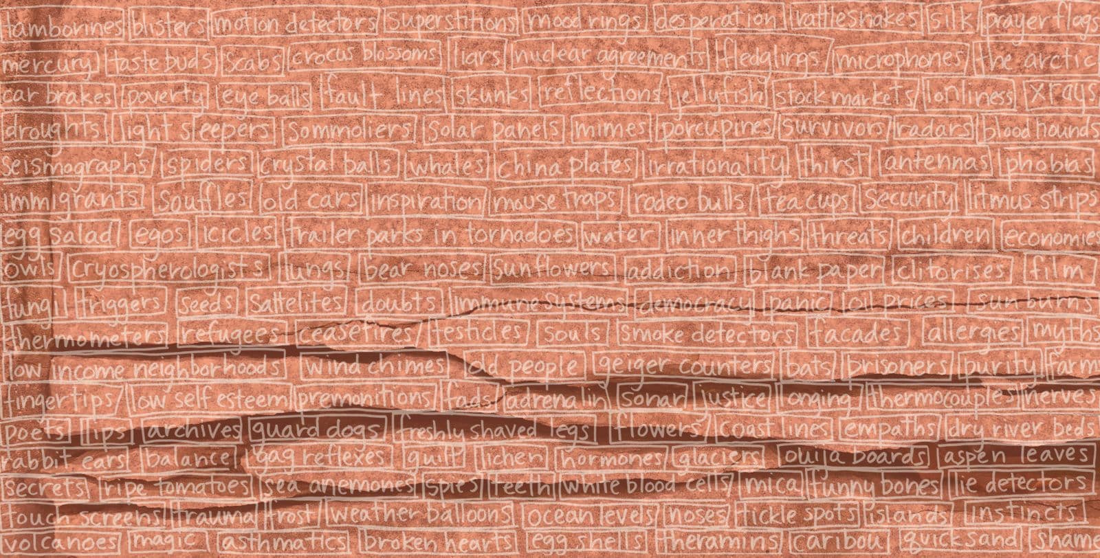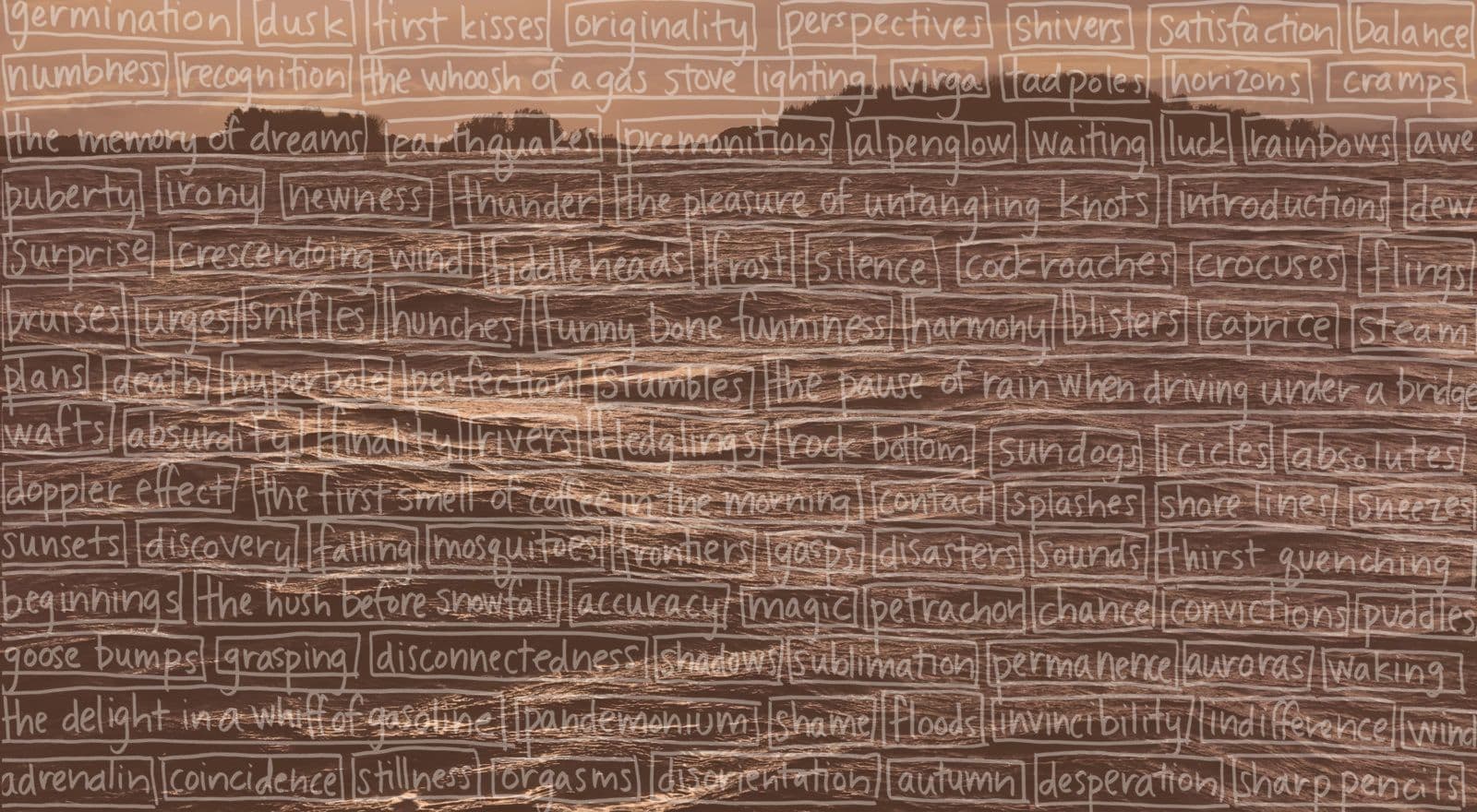 Elder’s Incomplete Lists are a part of her ongoing investigation into the act of bearing witness, and reflections on her personal experience of interdisciplinary research. The process begins by trying to answer questions, as exhaustively as possible, in one sitting. For example: What is fleeting? What might offer protection? What is sensitive? Elder then rearranges the words until there is no hierarchy and no pattern. These lists function both as drawings and as poems.