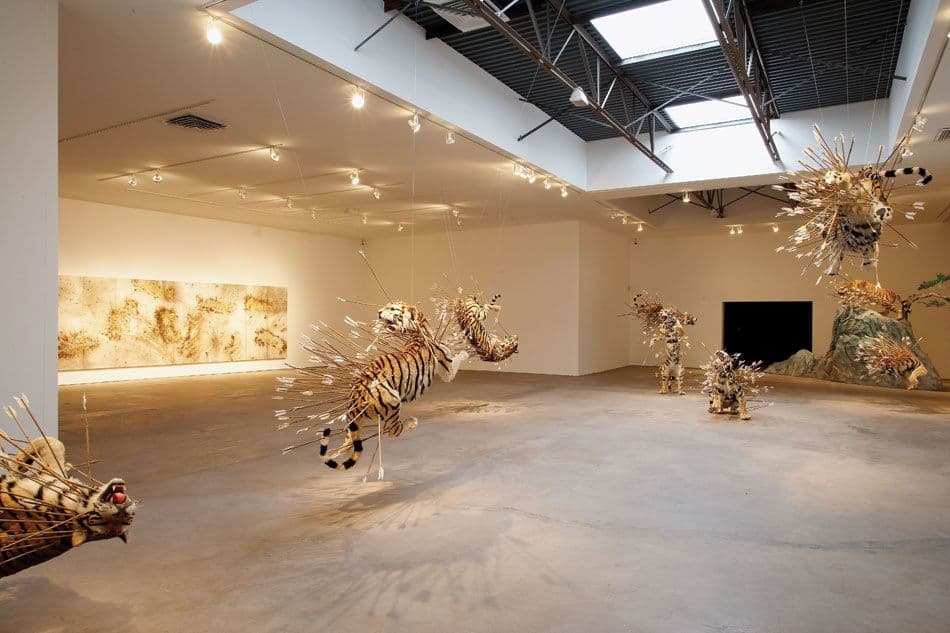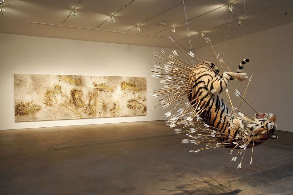Known for his vast orchestrations of gunpowder projects and large, theatrical sculptures, Cai Guo-Qiang will create a dramatic, multi-part installation titled Inopportune. The main installation at SITE features nine realistic tigers crouching, pouncing, and leaping through the air. Hundreds of bamboo arrows pierce the tigers, seemingly lifting them skyward. The tiger imagery refers to a famous 13th-century Chinese story of Wu Song, a bandit who saved a village from a man-eating tiger that terrorized it and became the paragon of heroism and bravery in China.