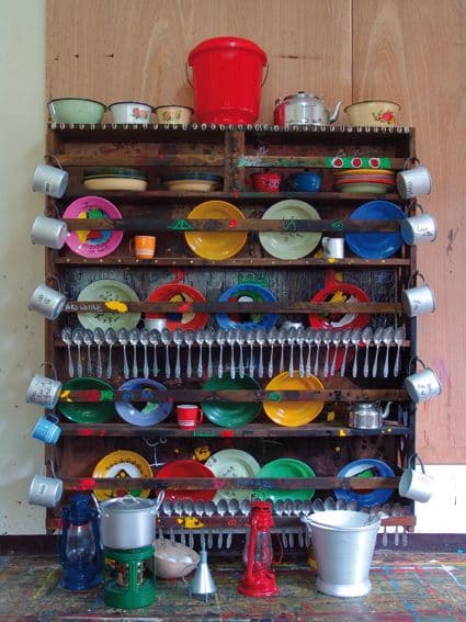 Kukuu/Kitchen is monumental public sculpture sited in Moengo made in collaboration with students from that town. Its structure is inspired by the practical yet aesthetic sculptural form used to store kitchen supplies and utensils in Maroon homes. Pinas has used the form as an inspiration for his own sculptures, and is currently working with young people in Moengo to create large-scale Kukuu. The students are filling the shelves with different households items new and used, including plates, spoons, tea kettles, etc., to create an assemblage.