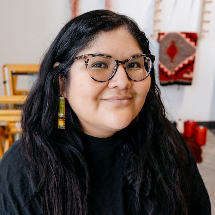 Dakota Mace (Diné) is an interdisciplinary artist who focuses on translating the language of Diné history and beliefs. Mace received her MA and MFA degrees in Photography and Textile Design at the University of Wisconsin-Madison and her BFA in Photography from the Institute of American Indian Arts. As a Diné (Navajo) artist, her work draws from the history of her Diné heritage, exploring the themes of family lineage, community, and identity. In addition, her work pushes the viewer's understanding of Diné culture through alternative photography techniques, weaving, beadwork, and papermaking.