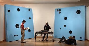 Tower Hollers (Version I), which was conceived during her residency at the World Trade Center Studios in 2001, is emblematic of the visual and aural contrasts that underscore Robinson’s artistic practice. For the installation, Robinson installed 100 12-inch by 12-inch panels in a grid on a wall. Consisting of 455 speakers – each embedded in one-foot square canvases of varying depths – the piece played abstract elevator “muzak” and remixed Negro work songs, creating a choral wall made of improvised, impassioned protest songs melded with vacuous, synthetically produced sounds.