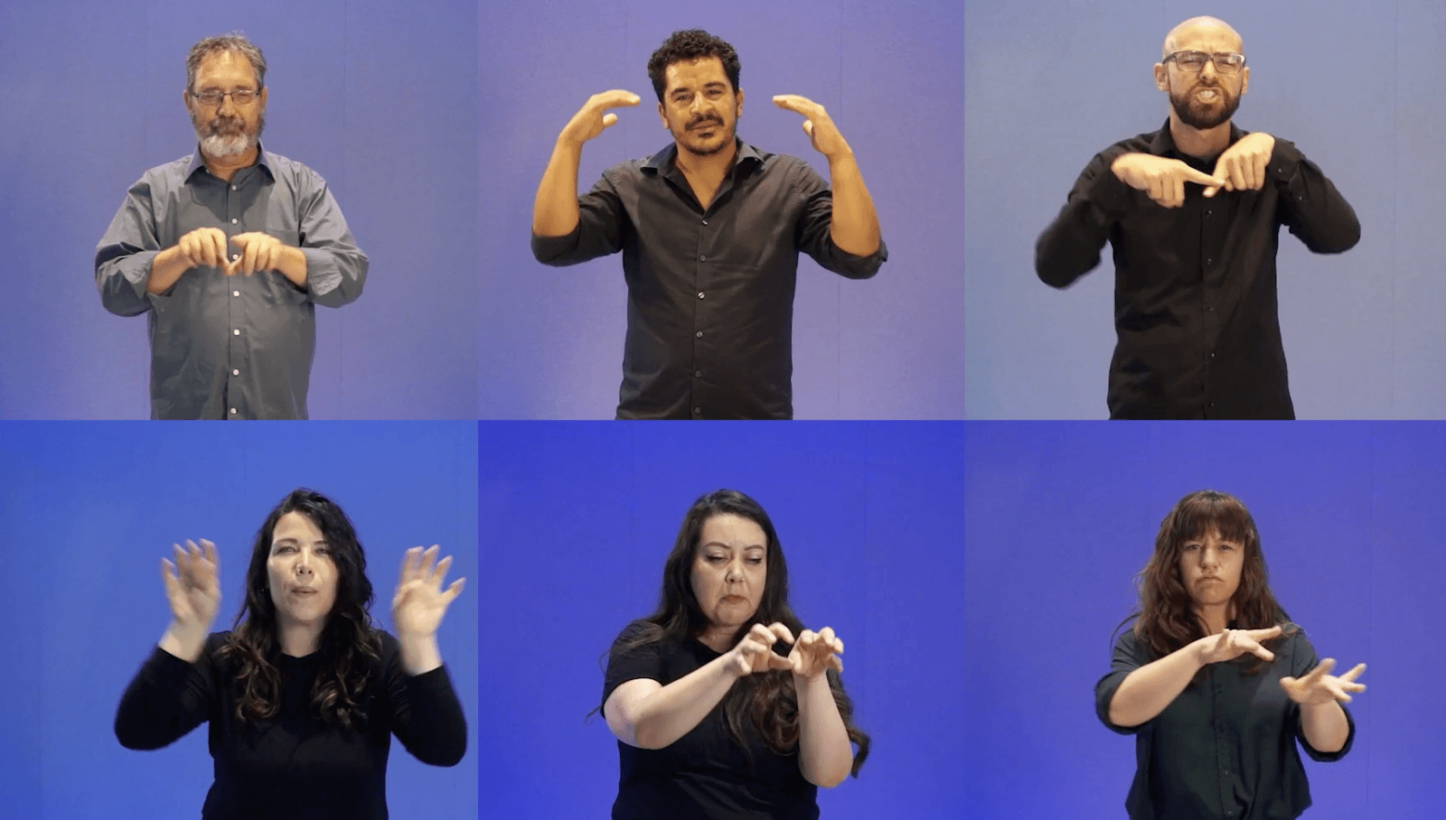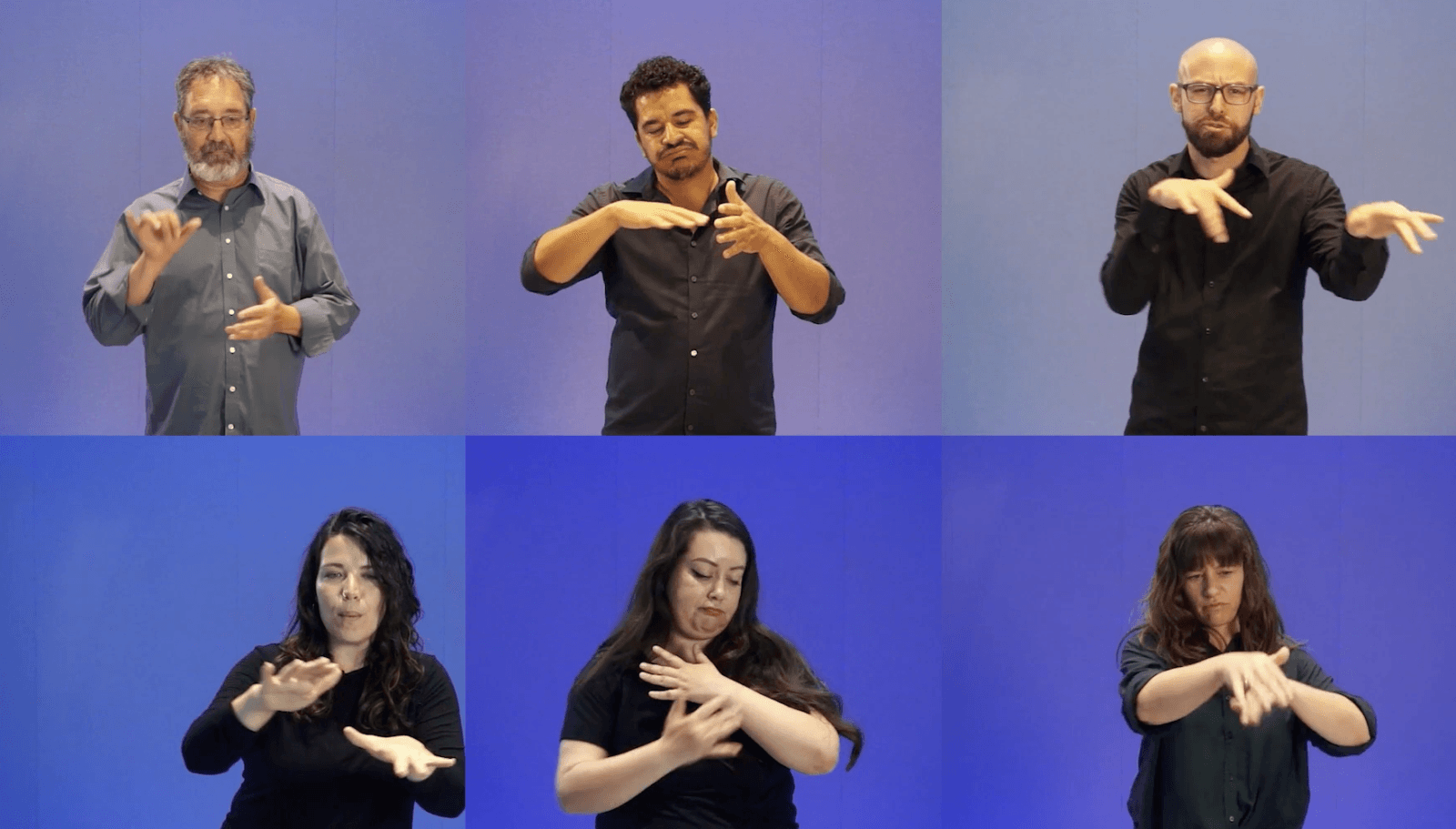 ASL interpreters sometimes need to describe sounds that do not have corresponding signs using a creative combination of handshapes, movements, and facial expressions. Investigating sound interpretation, Goldberg assembled a group of ASL interpreters to creatively interpret a variety of sounds curated by musician Alex Simon. Originally presented initially at the Motorama Drive In, RGC Access interpreters Lin Marksbury, Adam Romero, Santana Chavez, Cynthia Jiron, Megan Goldberg, and Tristan Lenzo interpret Simon’s unique soundtrack in a video produced by Andrew Primm.