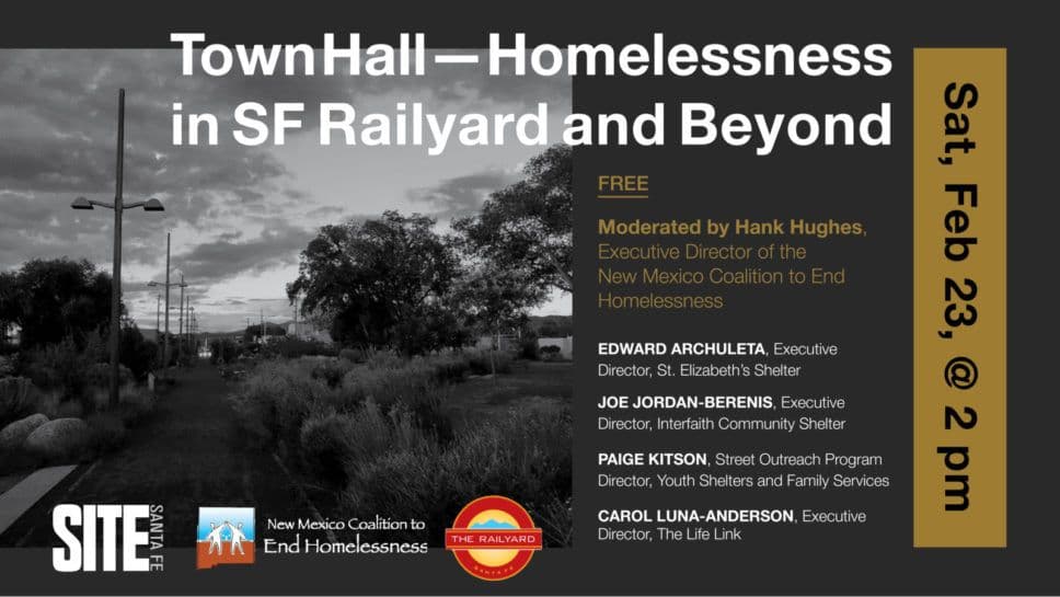 SITE Santa Fe presents a town hall meeting on homelessness in the Railyard Park and in Santa Fe, held in the Marlene Nathan Meyerson Auditorium. Attendees will learn about the general landscape of homelessness; resources for people experiencing homelessness; and actions the larger community take to help Santa Fe’s homeless population.