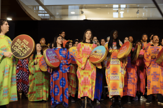Each performer will wear a custom garment designed by Jeffrey Gibson that has a “name” or text printed on it. This “name” describes an action or event that Jeffrey has found inspirational and courageous in the recent and current political climate.