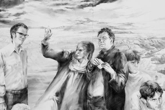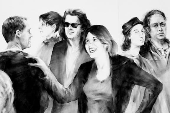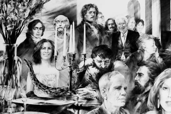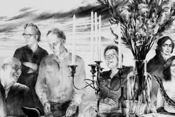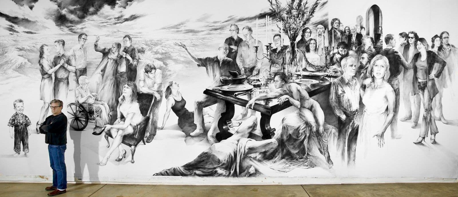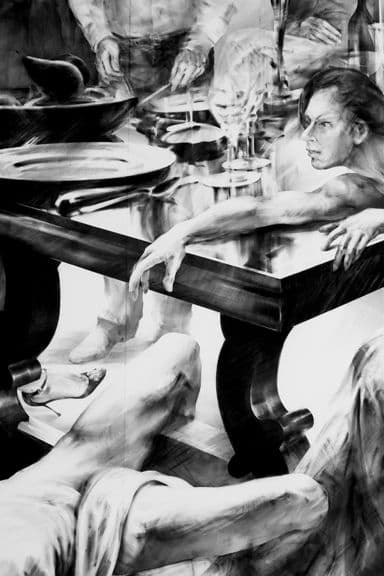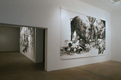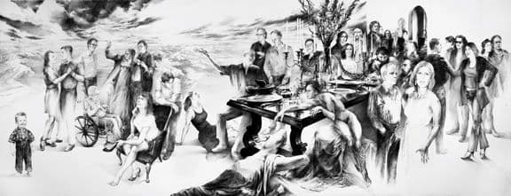 James Drake explores animal and human nature in City of Tells, an exhibition of his latest work. The exhibition will consist of two large pieces of approximately the same size (12 feet high by 32 feet long). One piece, a video projection in three parts, documents the spontaneous actions and responses elicited in different animals—a herd of hungry swine, a hummingbird, a python—when confronted with a banquet table. The other piece, a charcoal drawing on paper, mounted on canvas, depicts a social gathering of important people in the artists life with the same banquet table in the foreground. By using the motif of the table as a Renaissance tableau, Drake references biblical tales and cultural mythology. City of Tells poetically addresses a collective Western history and daily life.