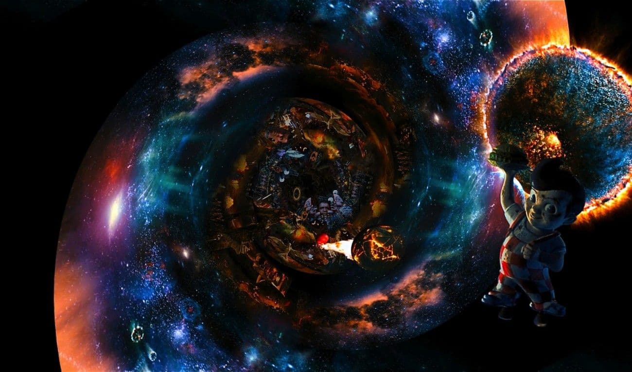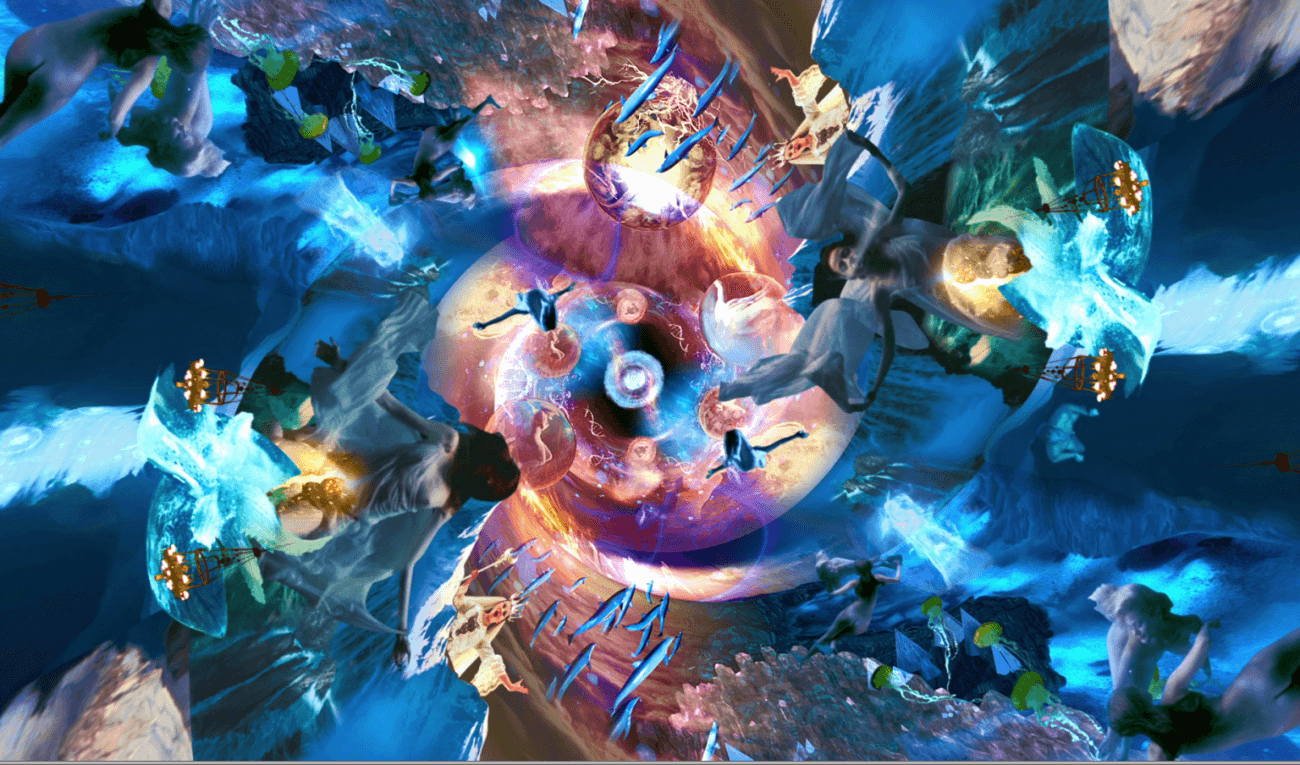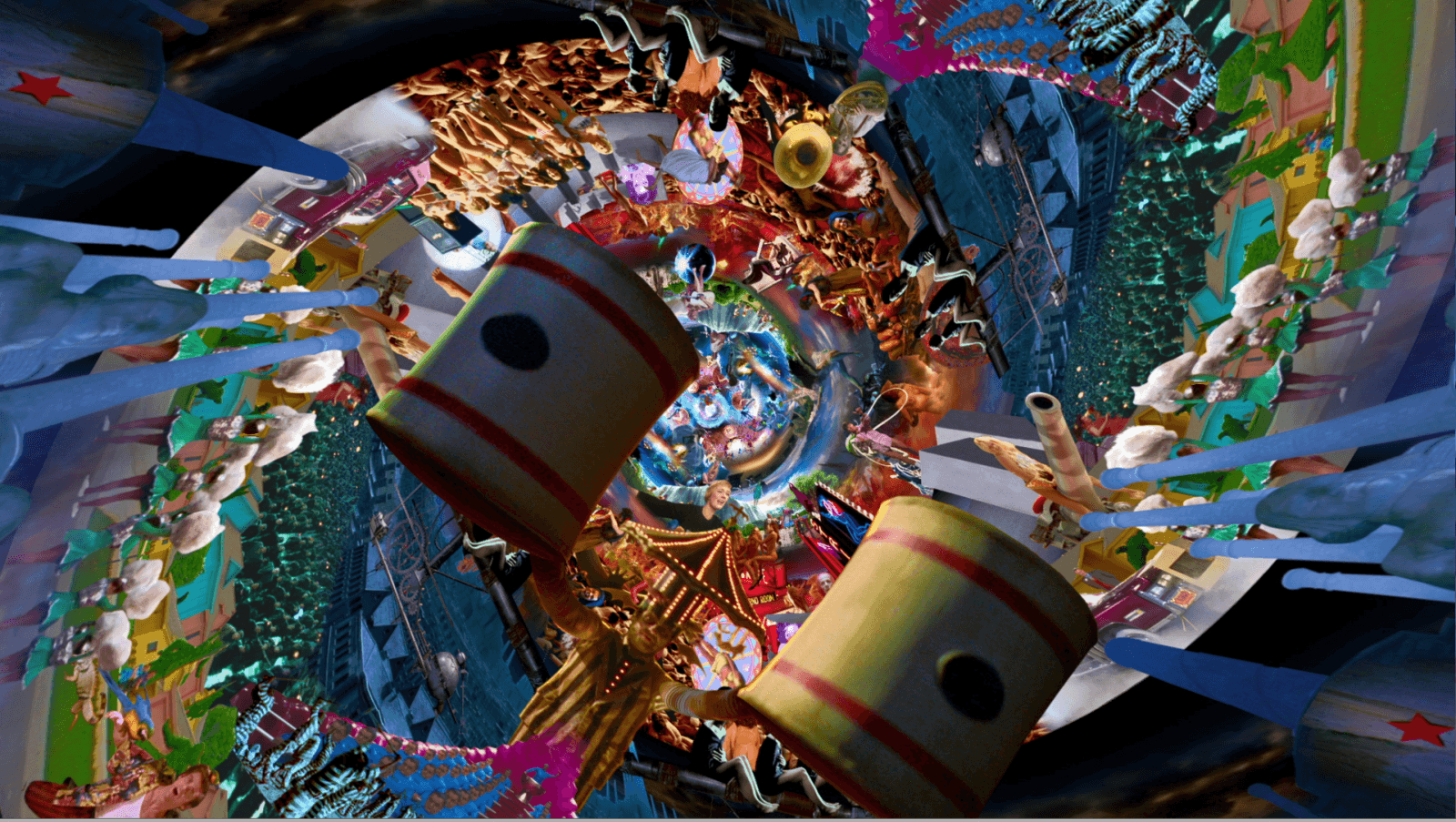 Creation (Megaplex) is the completion of a trilogy of 3D video collages that began with Civilization (Megaplex) (2008) and Evolution (Megaplex) (2010). Creation (Megaplex) presents a spectacle of over 500 clips from a vast archive of iconic Hollywood and international films. Set within the form of a giant DNA double-helix, Brambilla takes the viewer on a spiraling trajectory that begins with a big bang and continues through embryonic inception, idyllic Eden-like bliss and decadence, and culminates in annihilation—only to then interminably re-invent itself. Brambilla creates a hyper-realistic landscape of meadows and burning cityscapes against which this cycle of human endeavor unfolds.