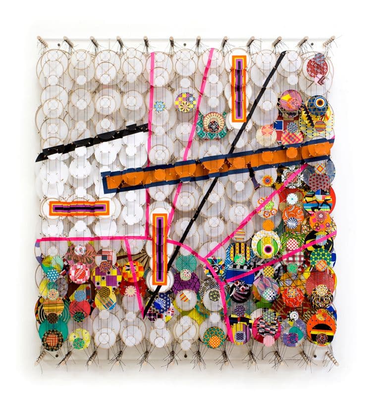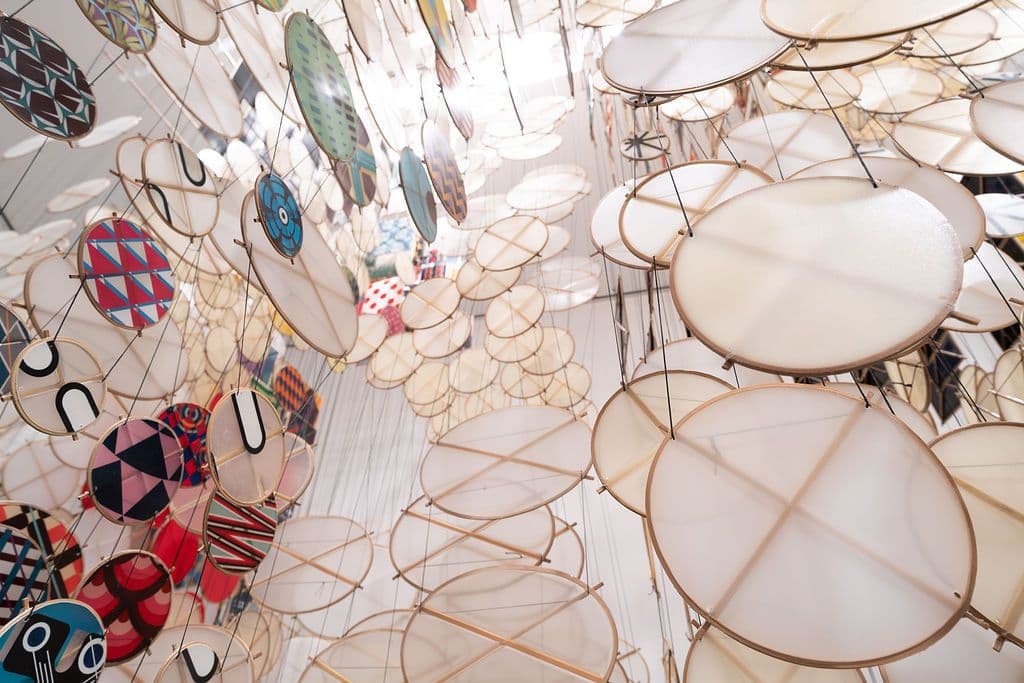 Central to the exhibition is an immersive installation made of brightly colored, and intricately patterned handmade Japanese rice paper “kites.” Clustered together in a cloud-like canopy suspended from the ceiling are layers of white, black, red, and yellow geometric tiles interspersed with bold and multi-colored patterns. Cured with resin, each piece is rich with a density and luster akin to encaustic or stained-glass, transforming the dynamic triangular space of the SITElab gallery.