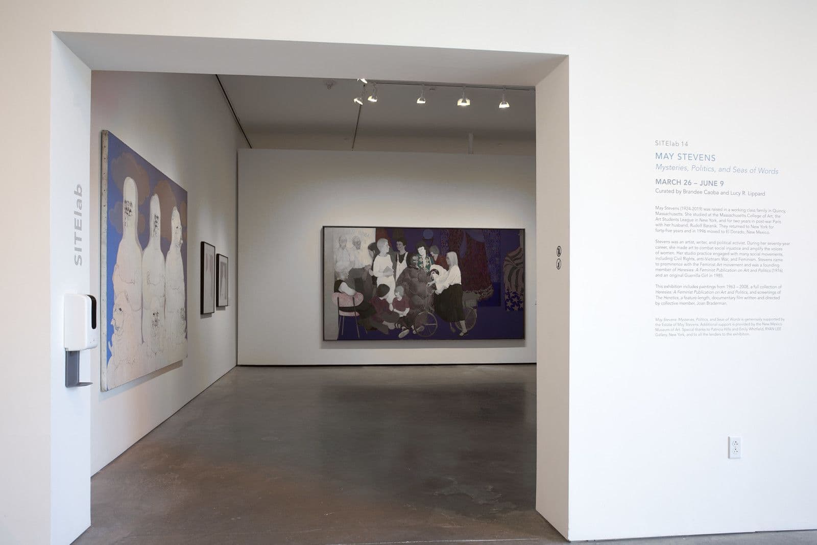 SITE Santa Fe presents May Stevens: Mysteries, Politics and Seas of Words, a survey of the career of the internationally recognized painter May Stevens (1924-2019). The exhibition includes Stevens’ work from 1970 to 2010, exploring her roles as a feminist artist and political activist. She was a founding member of Heresies: A Feminist Publication on Art and Politics and the Guerrilla Girls. Throughout her seventy-year career, Stevens made art to combat social injustice and bring about change, elevating the silenced voices of women throughout history. In the last years of her studio practice, she focused on meaningful landscapes, some local. Stevens lived in El Dorado, New Mexico from 1997 until her death in 2019.