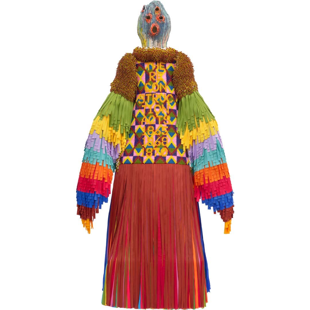 Jeffrey Gibson, The Enforcer, 2024, Ceramic, glass beads, plastic beads, nylon grosgrain ribbon, tin jingles, nylon thread, canvas, acrylic felt, cold-rolled mild steel, steel plate; 84 × 40 × 24 in. (213.4 × 101.6 × 61 cm)